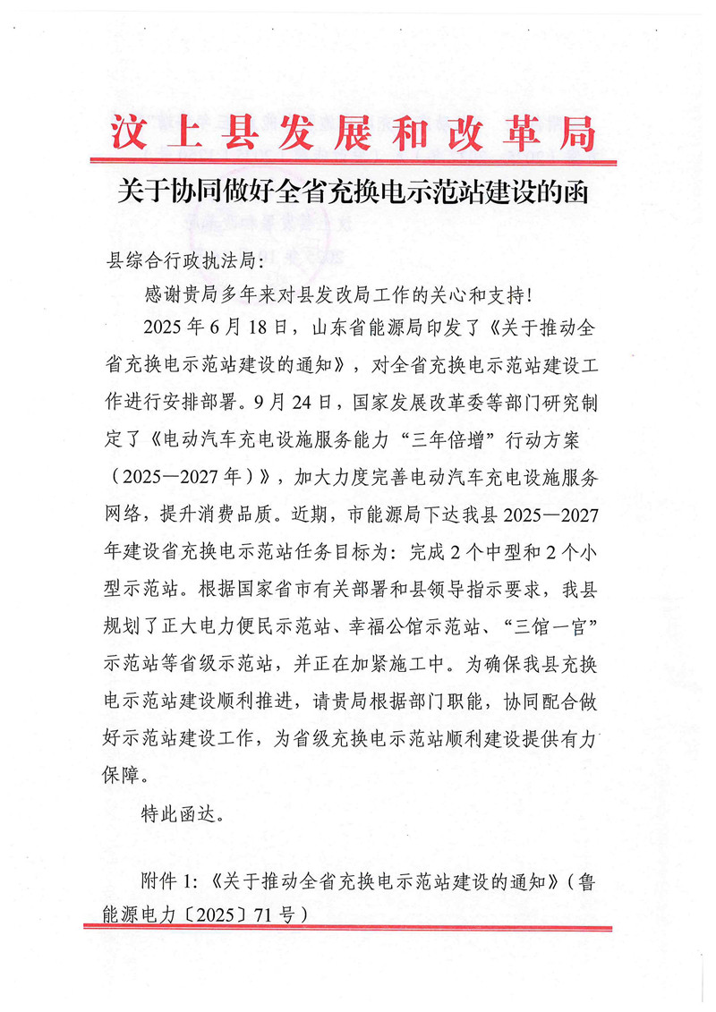 感謝貴局多年來對縣發(fā)改局工作的關(guān)心和支持!2025年6月18日,山東省能源局印發(fā)了《關(guān)于推動(dòng)全省充換電示范站建設(shè)的通知》,對全省充換電示范站建設(shè)工作進(jìn)行安排部署。9月24日,國家發(fā)展改革委等部門研究制定了《電動(dòng)汽車充電設(shè)施服務(wù)能力“三年倍增”行動(dòng)方案(2025-2027年)》,加大力度完善電動(dòng)汽車充電設(shè)施服務(wù)網(wǎng)絡(luò),提升消費(fèi)品質(zhì)。近期,市能源局下達(dá)我縣2025-2027年建設(shè)省充換電示范站任務(wù)目標(biāo)為:完成2個(gè)中型和2個(gè)小型示范站。根據(jù)國家省市有關(guān)部署和縣領(lǐng)導(dǎo)指示要求,我縣規(guī)劃了正大電力便民示范站、幸福公館示范站、“三館一官’示范站等省級示范站,并正在加緊施工中。為確保我縣充換電示范站建設(shè)順利推進(jìn),請貴局根據(jù)部門職能,協(xié)同配合做好示范站建設(shè)工作,為省級充換電示范站順利建設(shè)提供有力保障。